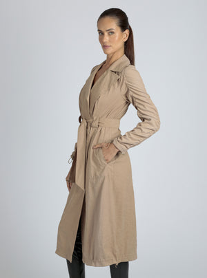 Introducing the Soft Penelope Trench - a functional and chic addition to your wardrobe. This luxurious piece features a double tunnel with tubular elastic and toggles for a personalized fit. The adjustable belt cinches at the waist for a flattering silhouette, while functional side pockets add convenience. With a 46" CB length, this trench is both stylish and practical. Elevate your style with this exclusive piece.