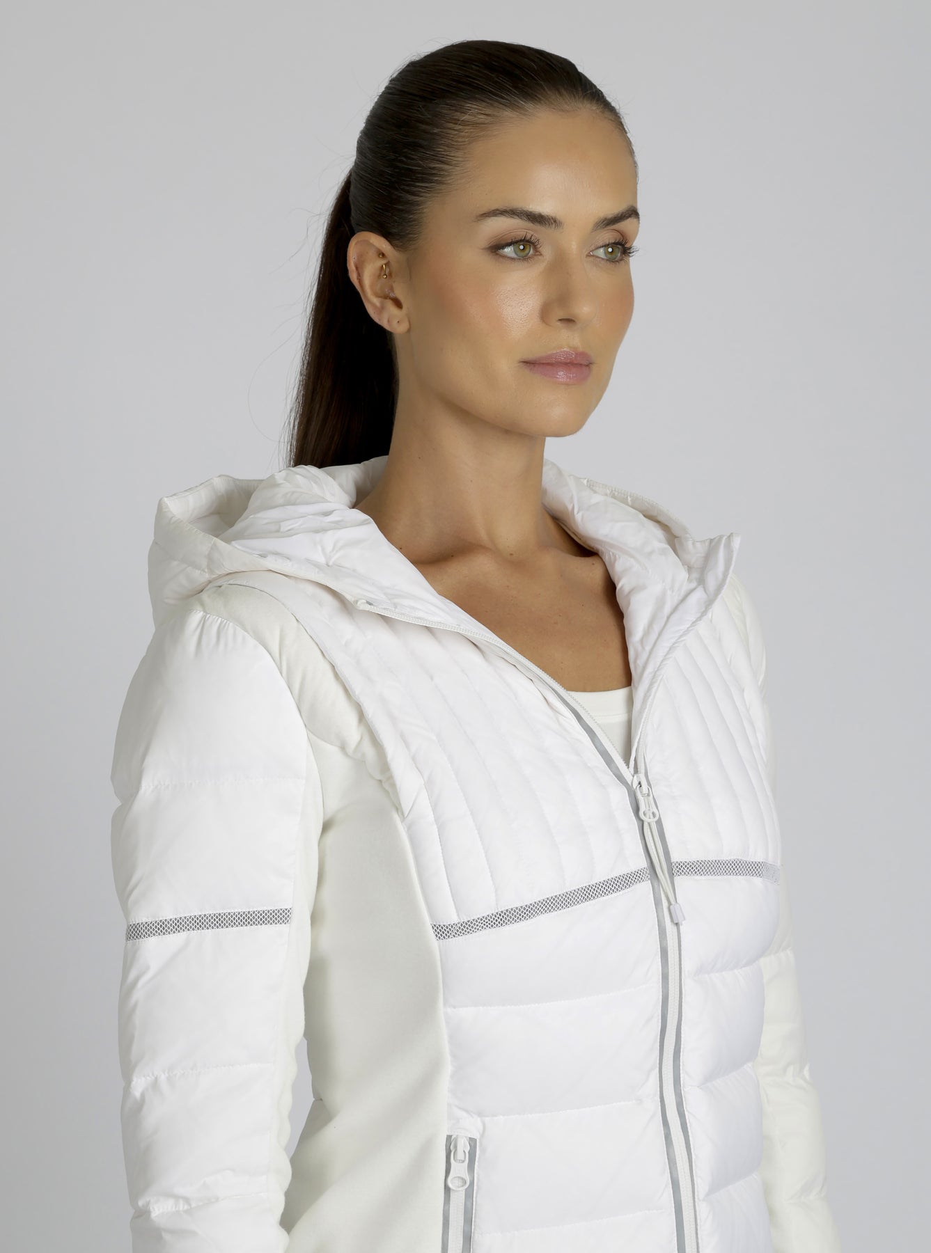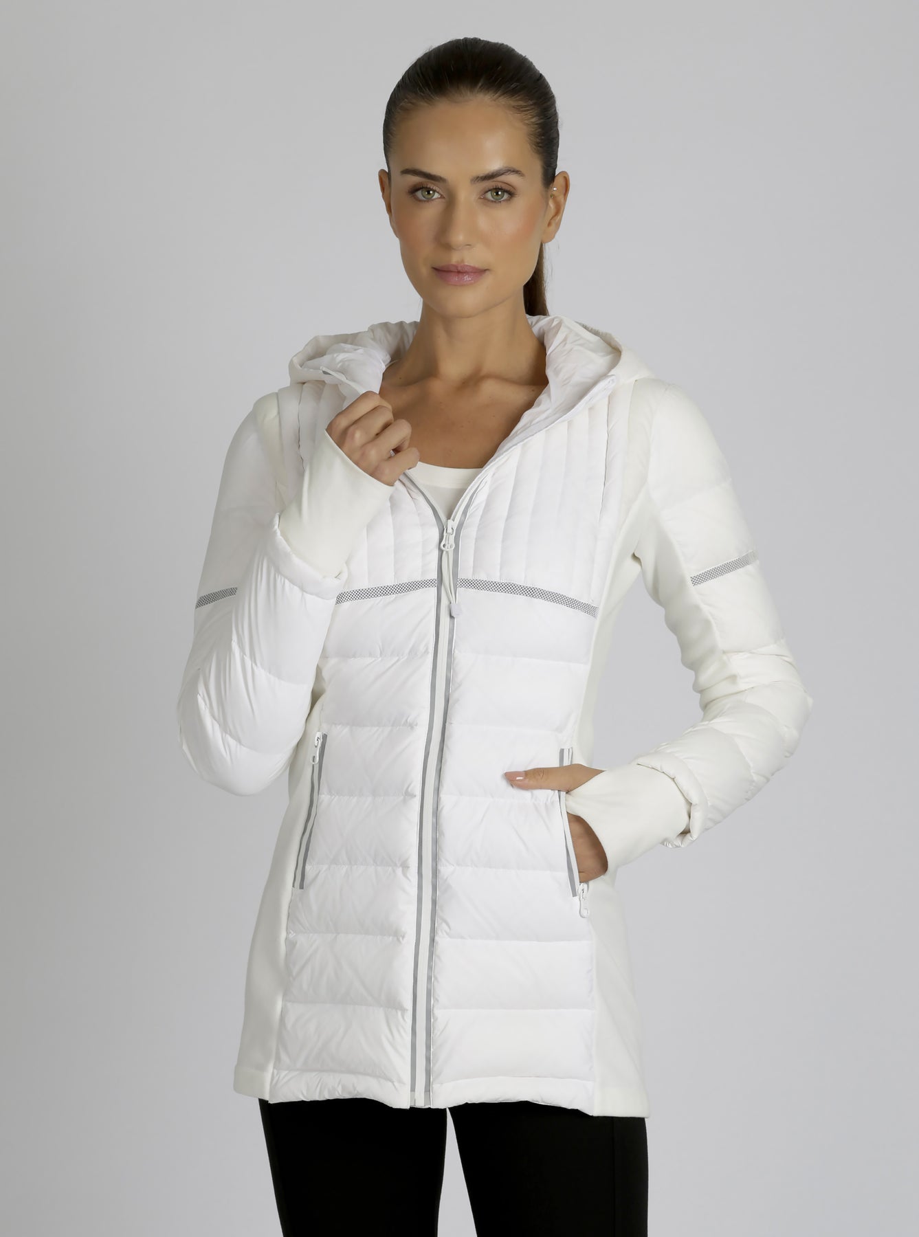 The Reflective Inset Featherweight Parka is a comfortable nylon and brushed jersey parka featuring knitted insets for easy motion, a down fill for warmth, and reflective details.