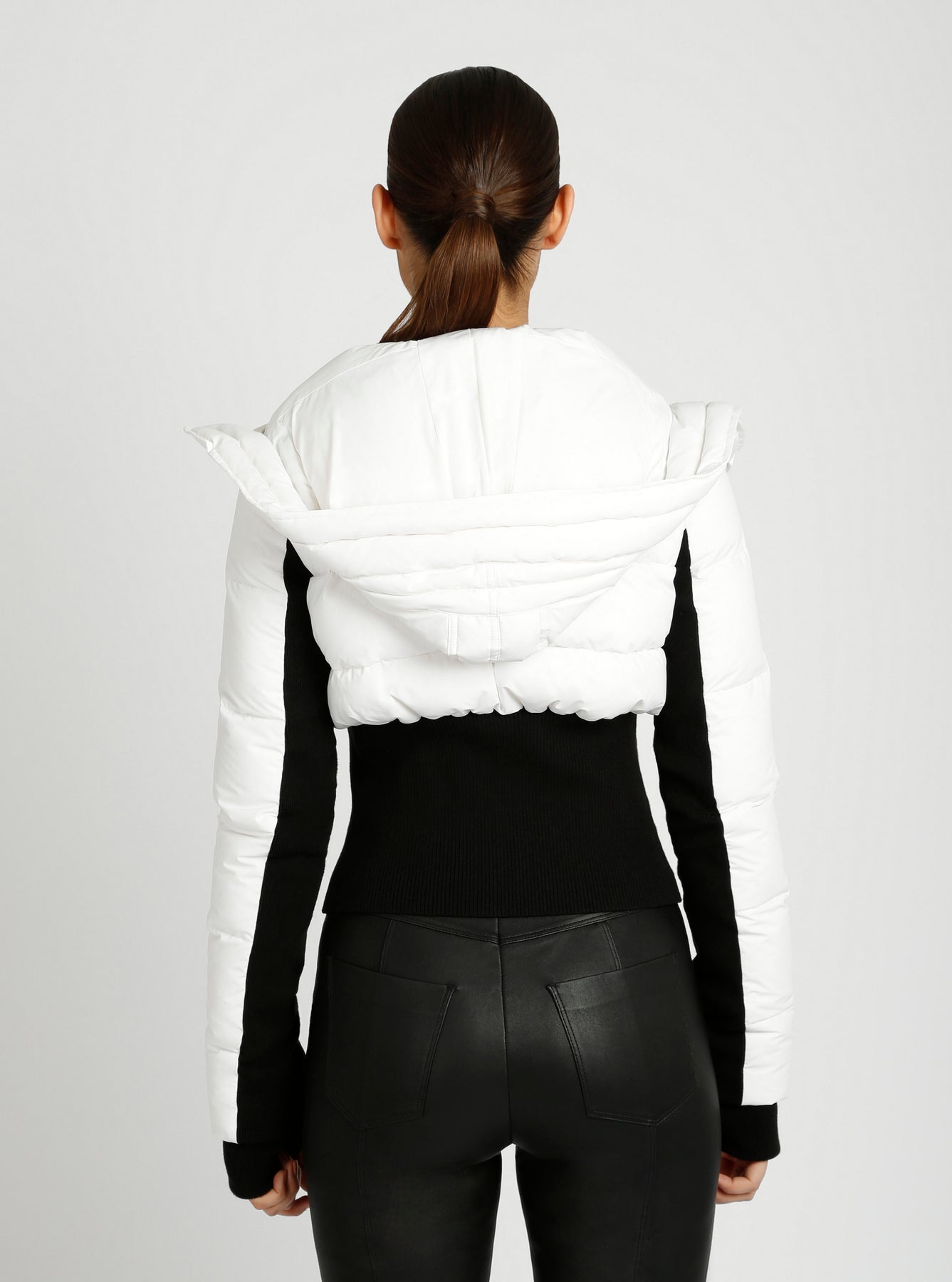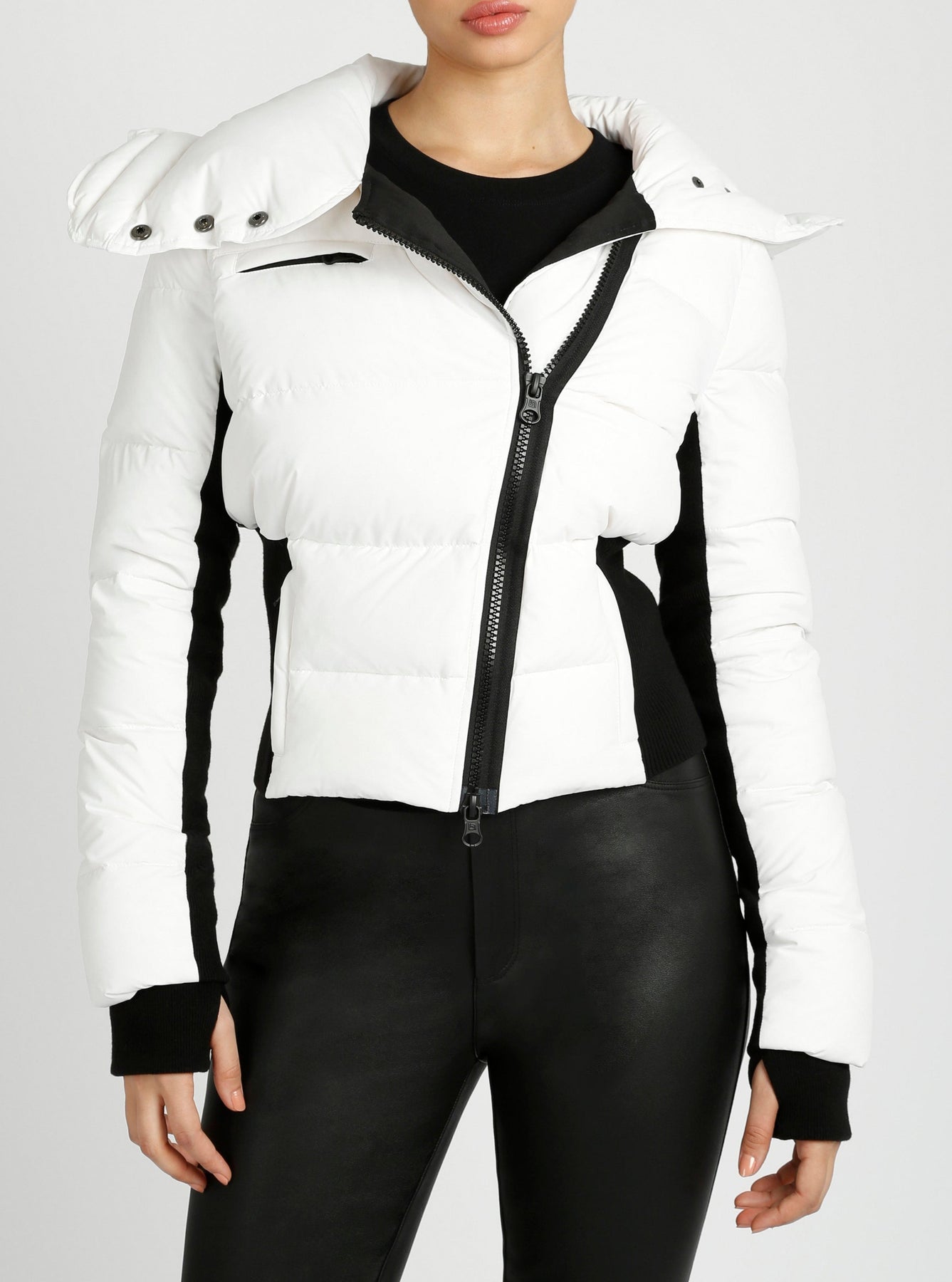 Look chic and stay warm in this sophisticated Asymmetrical Puffer Jacket. It features Trapunto stitching at the shoulder and sleeves, exposed welded pockets and zippers, a zipped front, and a hood for additional warmth. An edgy and modern piece with 23-3/4" CB length, this jacket is sure to turn heads.