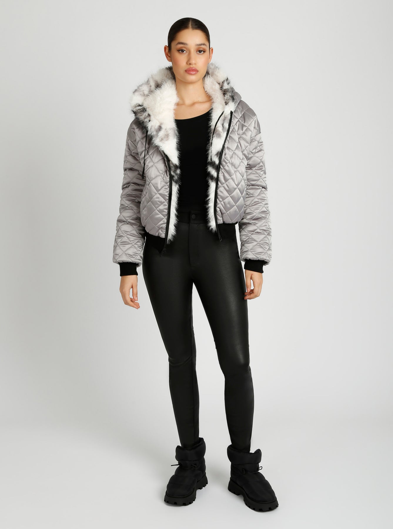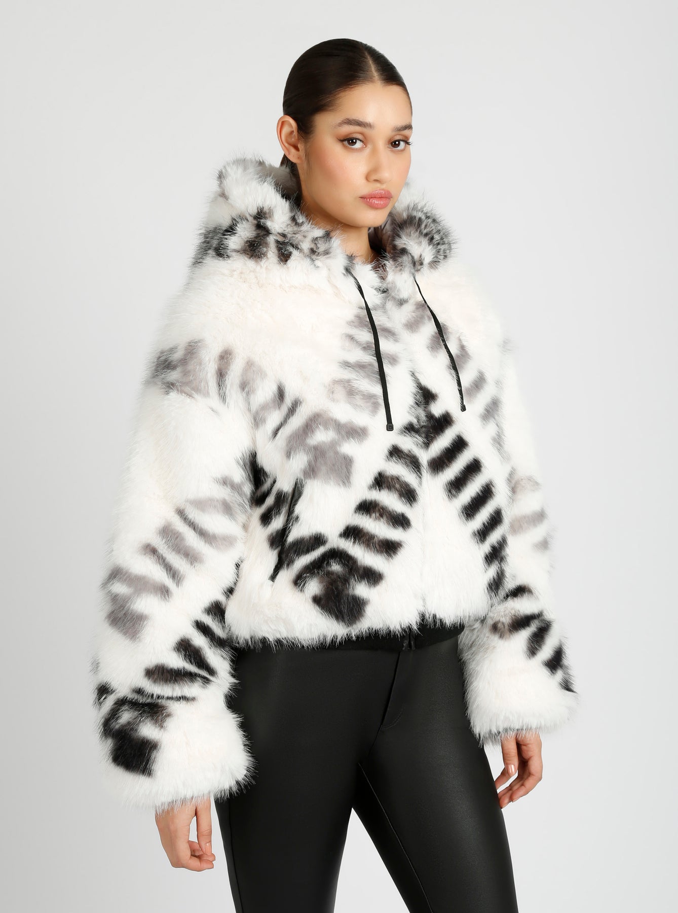 Indulge in luxury with our Galena Reversible Faux Fur Hoodie. This sophisticated jacket features a functional drawcord at the hood and front zip pockets, ensuring warmth and practicality. Its unique reversible design adds versatility to your wardrobe, while the 21-1/2" CB length offers a flattering fit. Elevate your style with this exclusive piece.