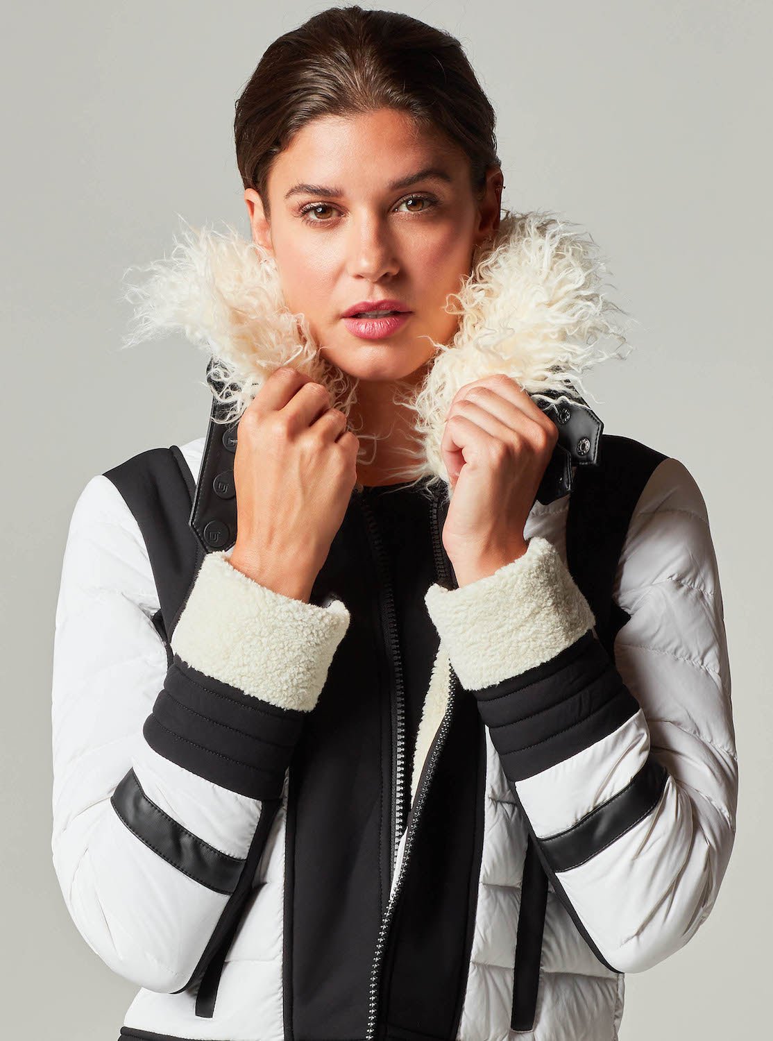 The Moto Aviator Puffer has a Faux Mongolian Collar Lining. This puffer features Down Fill And Bonded Sherpa Fabric For Warmth.