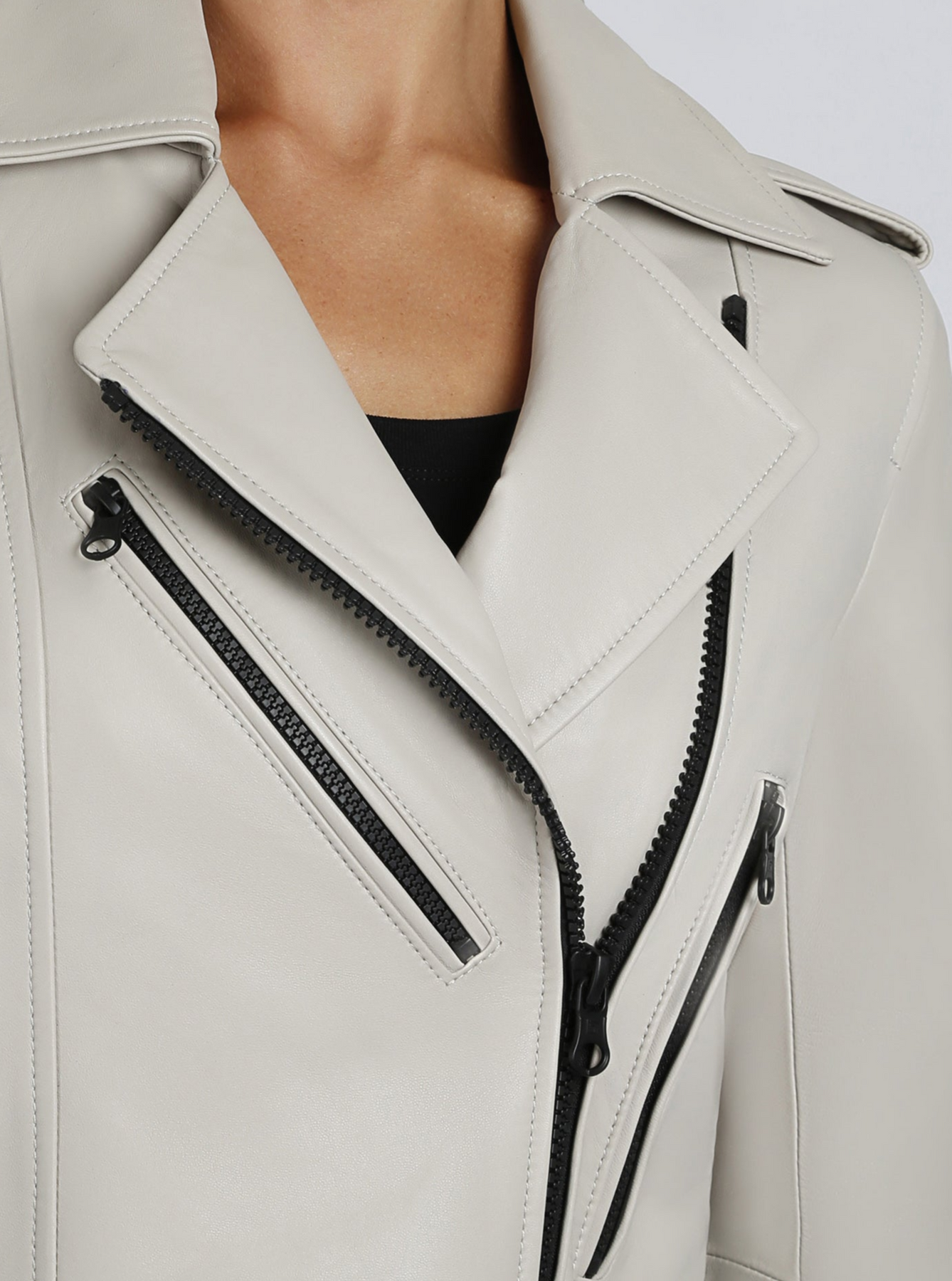 Crafted from 100% lamb leather, the Cleo Cropped Moto Jacket exudes a bold and edgy look. With a striking zip sleeve and pockets, this jacket stands out in both style and functionality. The polyester and spandex lining offers a comfortable fit, making it the perfect addition to your wardrobe. At a length of 17", this jacket is the perfect combination of fashion and versatility.