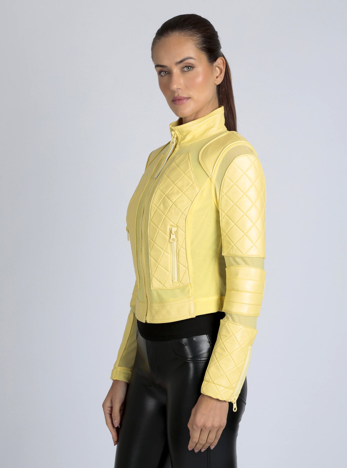 This stylish leather mesh jacket offers adjustable laces for the perfect fit, power mesh inserts for breathability and climate control, and an iPhone pocket for convenience. With diamond quilted leather, zippered cuffs and pockets, and a range of bright colors, this jacket is both functional and fashionable.