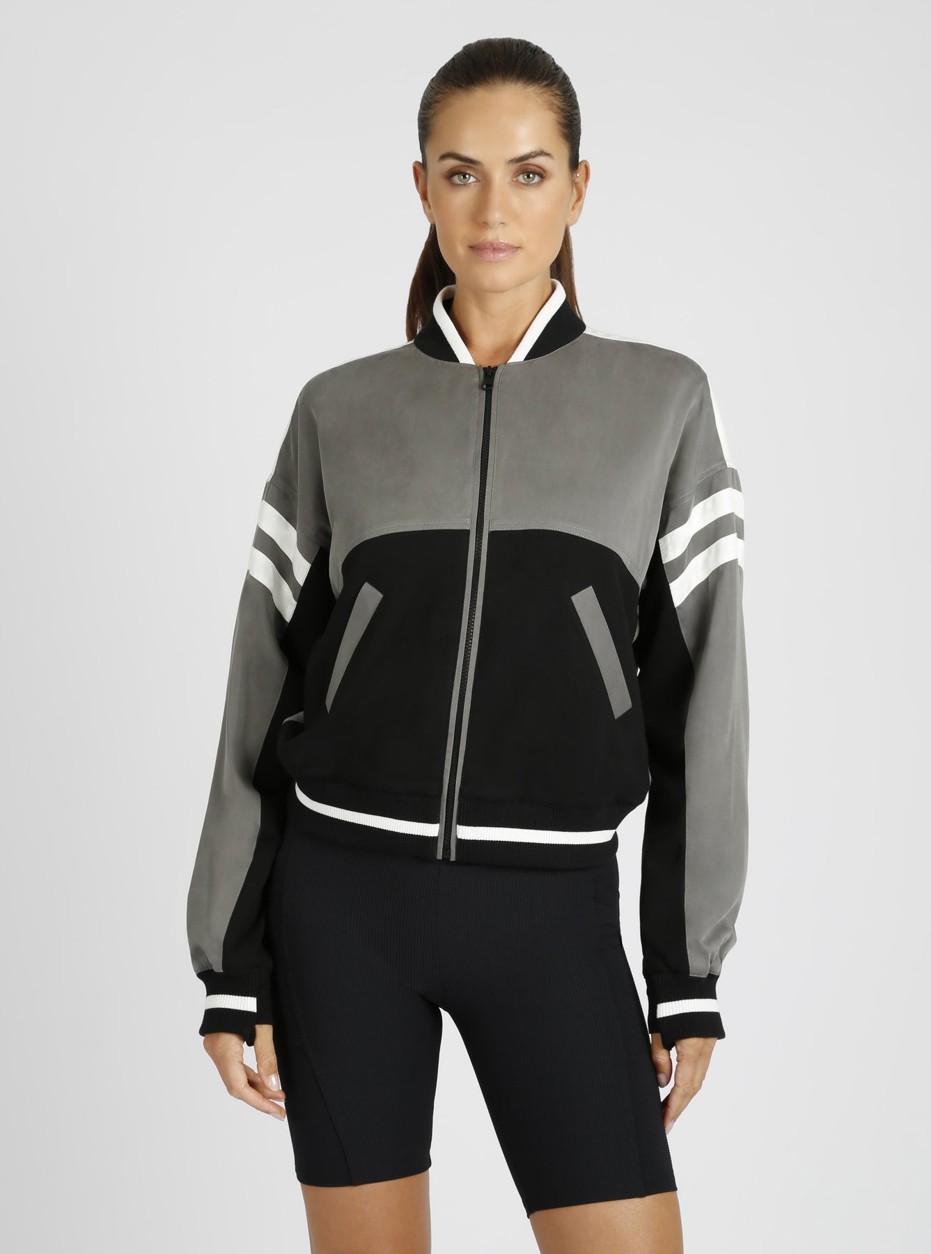 Introducing the New Natoma Jacket. Featuring a functional zipper at the front and convenient pockets, this jacket is both stylish and practical. The 2x2 rib with stripe detailing on the cuffs and collar adds a touch of sporty edge. Plus, with thumbholes and a length of 22 1/4 inches, this jacket is perfect for any occasion. Elevate your wardrobe with this luxurious piece.