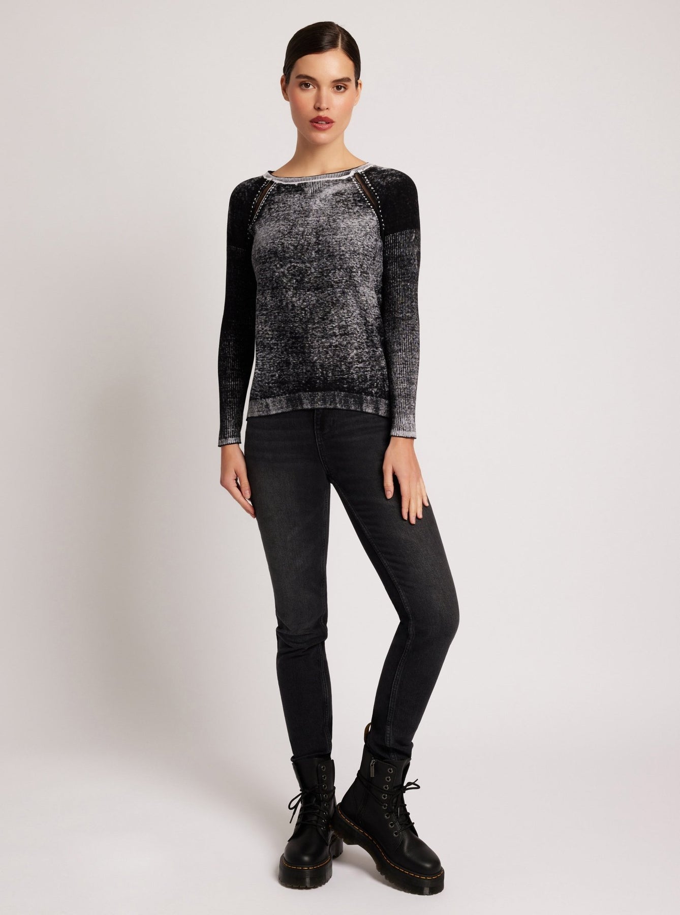 The Huntress Mesh Boyfriend Sweater offers a unique blend of style and comfort. Its printed reverse and mesh inset at the armhole offers a sophisticated look, perfect for confident women. Highlighted by a length of 23-1/2" for a flattering fit, this sweater is an exquisite selection for those seeking a luxury look.