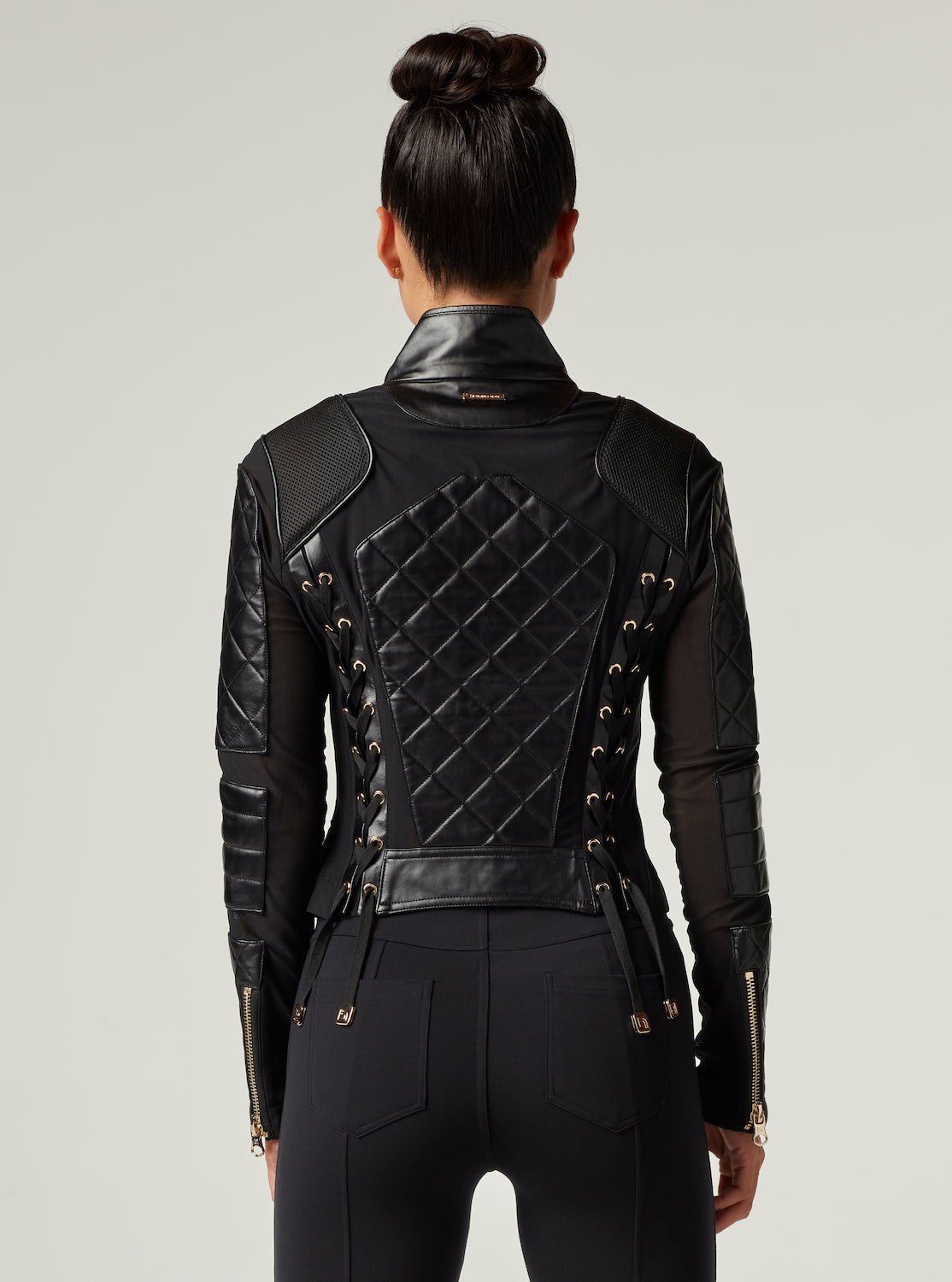 Mesh Moto Jacket with Black Leather & Gold Trims - Gold Collection with Lace Up Back