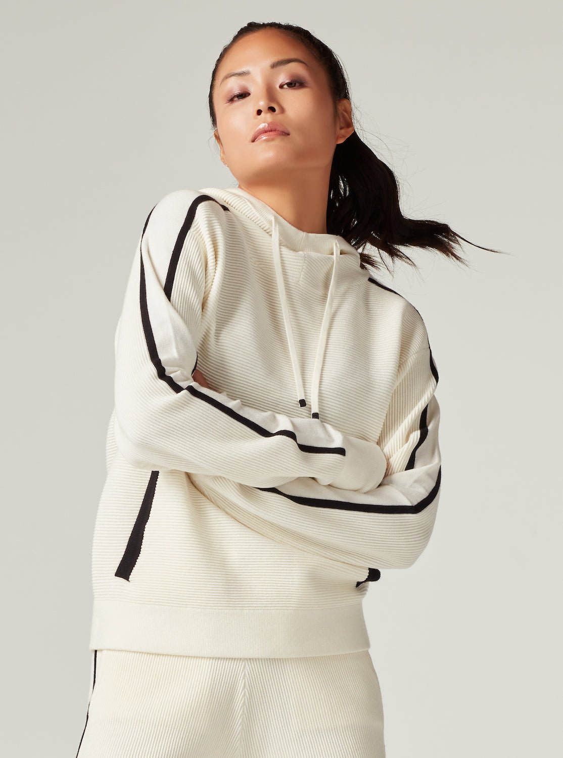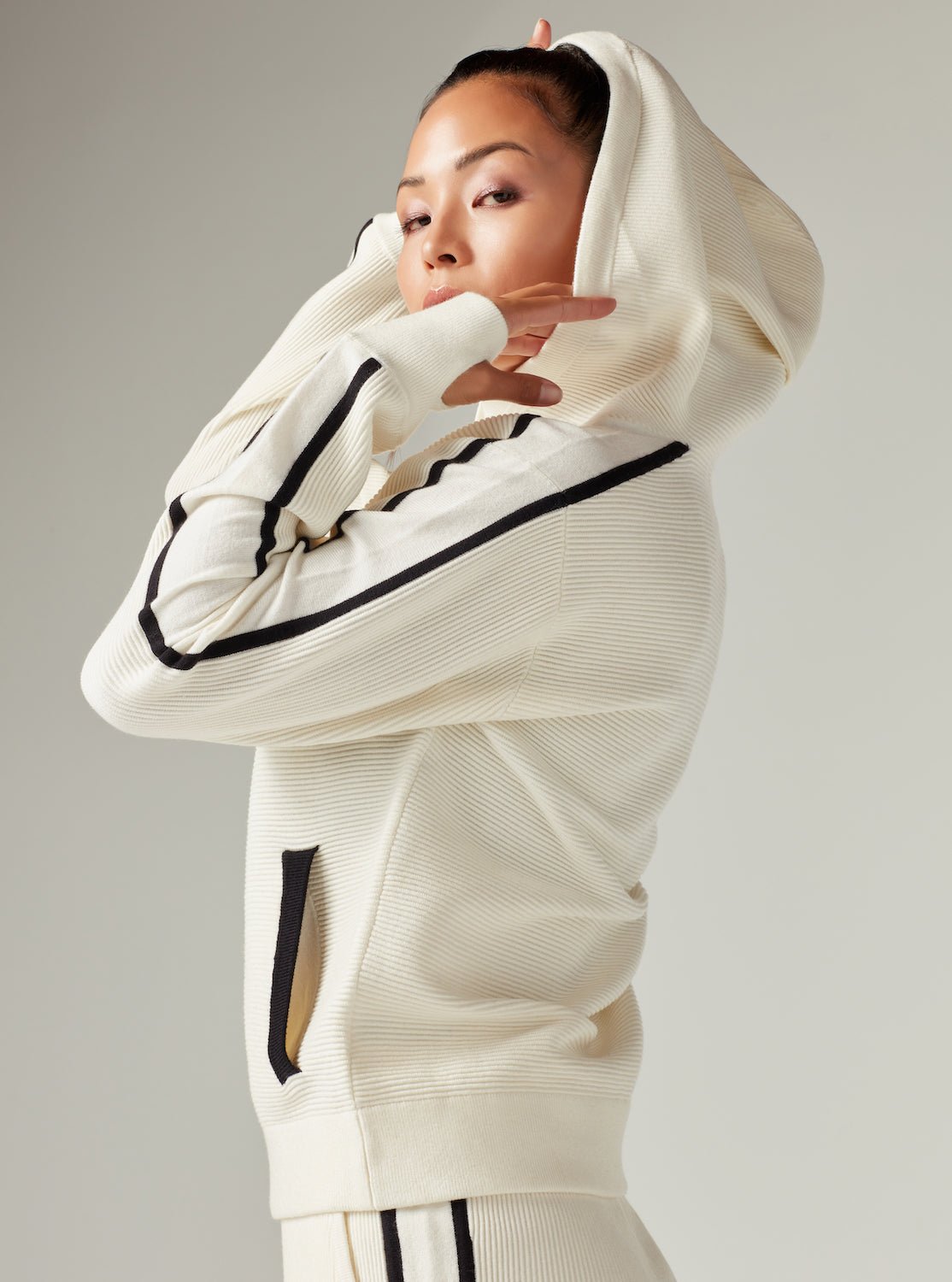 A Blanc Noir customer favorite, The Portola Pullover Hoodie. This sweater is the perfect combination of cool and cozy. Features functional pockets, drawcord hood, and thumbholes for added detail. A touch of cashmere for extra coziness!  Pairs perfectly with the Portola Short or Jogger.