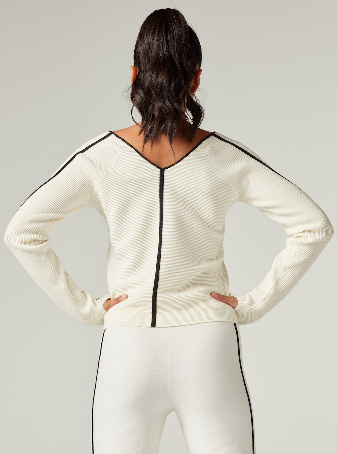 A Blanc Noir customer favorite, The Portola V Neck Sweater. This sweater is the perfect combination of cool and cozy. Features cashmere blend fabric and thumbholes for added detail. Pairs perfect with the Portola Jogger or Short.